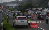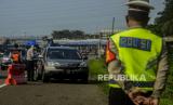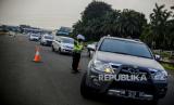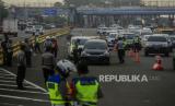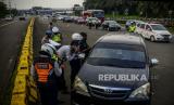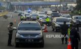 Polisi menghentikan mobil yang keluar dari Gerbang Tol Bogor saat melakukan penyekatan di Bogor, Jawa Barat, Jumat (7/5). Satgas Covid-19 melarang adanya mudik lokal di kawasan aglomerasi selama 6 Mei hingga 17 Mei 2021, untuk mencegah penyebaran Covid-19. Republika/Putra M. Akbar (FOTO : Republika/Putra M. Akbar)