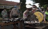 REPUBLIKA.CO.ID, BANYUMAS -- Petugas memusnahkan barang bukti petasaan di Polresta Banyumas, Jateng, Jumat (7/5/2021). Polresta Banyumas memusnahkan 750 botol miras pabrikan, 270 liter miras tradisional, 1,2 juta petasan, satu kilogram serbuk petasan dan 30 knalpot brong hasil razia selama bulan Ramadhan 1442 H.