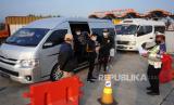 Petugas Kepolisian menurunkan penumpang yang tidak membawa kelengkapan dokumen perjalanan saat penyekatan mudik lebaran 2021 di Gerbang Tol Palimanan, Jawa Barat, Sabtu (8/5). Pada hari ketiga diberlakukannya larangan mudik lebaran, kendaraan penumpang yang tidak dilengkapi dokumen perjalanan lengkap diputarbalikkan oleh petugas di Gerbang Tol Palimanan. Foto : Edwin Putranto/Republika (FOTO : Republika/Edwin Dwi Putranto)