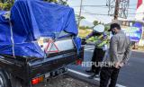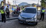 Petugas gabungan melakukan penyekatan kendaraan dengan plat nomor dari luar Garut di posko penyekatan larangan mudik di Jalan Nanggeleng, Limbangan, Kabupaten Garut, Ahad (9/5). (FOTO : REPUBLIKA/ABDAN SYAKURA)