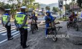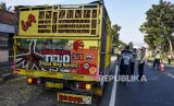 Petugas kepolisian memutarbalikan kendaraan angkutan umum di posko penyekatan larangan mudik di Jalan Nanggeleng, Limbangan, Kabupaten Garut, Ahad (9/5). Memasuki hari keempat penerapan larangan mudik Lebaran 2021, petugas gabungan di posko penyekatan larangan mudik Limbangan telah memutarbalikan sedikitnya 150 kendaraan berplat luar kota dari arah Bandung menuju Garut dan Tasikmalaya karena tidak memiliki surat kesehatan serta ijin perjalanan. (FOTO : REPUBLIKA/ABDAN SYAKURA)