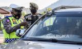 Petugas gabungan memeriksa identitas pengemudi kendaraan dengan plat nomor dari luar Garut di posko penyekatan larangan mudik di Jalan Nanggeleng, Limbangan, Kabupaten Garut, Ahad (9/5). (FOTO : REPUBLIKA/ABDAN SYAKURA)
