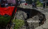 Warga melintas di dekat jalan yang longsor di Kampung Setu Asem, Mekarwangi, Tanah Sareal, Kota Bogor, Senin (10/5). Jalan yang longsor akibat hujan dengan intensitas deras dan tergerusnya pondasi tanah oleh aliran Kali Cigede Kulon. Bencana tersebut mengancam keselamatan tiga unit rumah warga hingga membuat jalan harus ditutup dari lalu lintas kendaraan. Republika/Putra M. Akbar (FOTO : Republika/Putra M. Akbar)