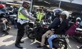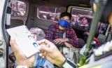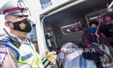 Petugas kepolisian memeriksa identitas penumpang kendaraan dengan plat nomor dari luar Bandung di posko penyekatan larangan mudik di gerbang Tol Padalarang, Kabupaten Bandung Barat, Senin (10/5). Pada hari kelima penerapan larangan mudik Lebaran 2021, petugas gabungan di posko penyekatan larangan mudik Padalarang telah memutarbalikan sedikitnya 30 kendaraan berplat luar kota karena tidak memiliki surat kesehatan serta ijin perjalanan. (FOTO : REPUBLIKA/ABDAN SYAKURA)