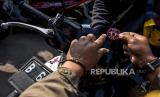 Petugas Satpol PP Kabupaten Bandung Barat menempelkan stiker ke kendaraan dengan plat nomor dari luar Bandung di posko penyekatan larangan mudik di gerbang Tol Padalarang, Kabupaten Bandung Barat, Senin (10/5). Pada hari kelima penerapan larangan mudik Lebaran 2021, petugas gabungan di posko penyekatan larangan mudik Padalarang telah memutarbalikan sedikitnya 30 kendaraan berplat luar kota karena tidak memiliki surat kesehatan serta ijin perjalanan. (FOTO : REPUBLIKA/ABDAN SYAKURA)