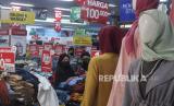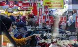 Pemandangan serupa terkadi saat Warga memilih pakaian saat berbelanja di salah satu pusat perbelanjaan di Cibubur, Jakarta Timur, Ahad (9/5). Sejumlah pusat perbelanjaan memberikan potongan harga berupa diskon 30 hingga 70 persen guna menarik minat pembeli jelang Hari Raya Idul Fitri.