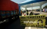 Personel kepolisian melakukan pengecekan truk yang keluar di pintu tol Pejagan, Brebes, Jawa Tengah, Ahad (9/5/2021). Menurut Satlantas Polres Brebes memasuki hari keempat pemberlakuan penyekatan pemudik, puluhan kendaraan berplat nomor luar kota dari arah Jakarta menuju Jawa Tengah diputar balik, karena tidak memiliki surat kesehatan dan ijin perjalanan. (FOTO : Antara/Oky Lukmansyah)