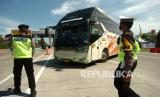 Personel kepolisian memutar balik bus yang keluar di pintu tol Pejagan, Brebes, Jawa Tengah, Ahad (9/5/2021). Menurut Satlantas Polres Brebes memasuki hari keempat pemberlakuan penyekatan pemudik, puluhan kendaraan berplat nomor luar kota dari arah Jakarta menuju Jawa Tengah diputar balik, karena tidak memiliki surat kesehatan dan ijin perjalanan. (FOTO : Antara/Oky Lukmansyah)