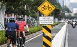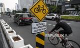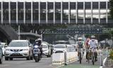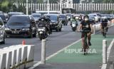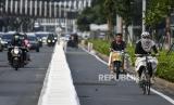 REPUBLIKA.CO.ID, JAKARTA -- Pesepeda memacu kecepatannya di luar jalur sepeda permanen di Jalan Jenderal Sudirman, Jakarta, Ahad (9/5/2021). Ditlantas Polda Metro Jaya berencana akan mengkaji ulang jalur sepeda permanen yang ada di kawasan Jenderal Sudirman dikarenakan volume lalu lintas cukup padat pada pukul 08.00 WIB hingga 09.00 WIB sedangkan intensitas pesepeda dinilai menurun.