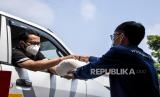 Petugas Amil Zakat melayani warga wajib zakat (muzaki) yang akan membayar zakat fitrah di Masjid Pimpinan Pusat (PP) Persis, Jalan Perintis Kemerdekaan, Kota Bandung, Senin (10/5). Masjid Pimpinan Pusat (PP) Persis membuka layanan pembayaran zakat fitrah menggunakan sistem drive thru atau layanan tanpa turun selama pandemi Covid-19 dengan memberlakukan protokol kesehatan guna mencegah penyebaran Covid-19. Foto: Republika/Abdan Syakura (FOTO : REPUBLIKA/ABDAN SYAKURA)