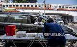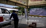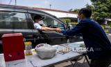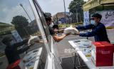Petugas Amil Zakat melayani warga wajib zakat (muzaki) yang akan membayar zakat fitrah di depan Masjid Pimpinan Pusat (PP) Persis, Jalan Perintis Kemerdekaan, Kota Bandung, Senin (10/5). Pusat Zakat Umat Lembaga Zakat Persis membuka layanan pembayaran zakat fitrah menggunakan sistem drive thru atau layanan tanpa turun selama pandemi Covid-19 dengan memberlakukan protokol kesehatan guna mencegah penyebaran Covid-19. Foto: Republika/Abdan Syakura (FOTO : REPUBLIKA/ABDAN SYAKURA)