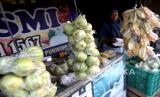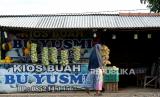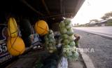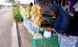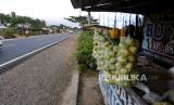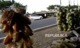 REPUBLIKA.CO.ID, PURWOREJO -- Buah jambu kristal digantung pedagang di sentra oleh-oleh buah Jalan Lintas Selatan, Purworejo, Jawa Tengah, Senin (10/5). Aturan larangan mudik lebaran 2021 berimbas lesunya pedagang oleh-oleh buah di Purworejo. Pada musim mudik sekarang penjualan lebih dibanding tahun lalu.