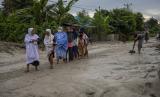 Sejumlah warga melintasi jalan yang tertutup lumpur di Desa Beka, Marawola, Kabupaten Sigi, Sulawesi Tengah, Selasa (11/5/2021). Banjir lumpur yang terjadi pada Selasa dini hari itu kembali menerjang desa tersebut, disebabkan oleh hujan di pegunungan dan mengakibatkan longsor serta membawa material ke pemukiman dan menutup jalan. (FOTO : ANTARA/Basri Marzuki)