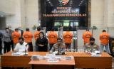 Para tersangka OTT Bupati Nganjuk dihadirkan beserta barang bukti ketika konferensi pers terkait OTT Bupati Nganjuk di Bareskrim Polri, Jakarta, Selasa (11/5). Dirtipikor Bareskrim Polri dan KPK menyita sejumlah barang bukti berupa uang tunai diduga hasil tindak pidana jual beli jabatan senilai Rp647.900.000 dari brankas pribadi Bupati Nganjuk dan menetapkan tujuh tersangka dalam kasua tersebut, termasuk Bupati Nganjuk. Penyidikan kasus OTT Bupati Nganjuk tersebut dilanjutkan oleh Bareskrim Polri.Prayogi/Republika. (FOTO : Prayogi/Republika.)