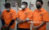REPUBLIKA.CO.ID, JAKARTA -- Polri merilis Bupati Nganjuk yang terkena operasi tangkap tangan di Bareskrim Polri, Jakarta, Selasa (11/5). Dirtipikor Bareskrim Polri dan KPK menyita sejumlah barang bukti berupa uang tunai diduga hasil tindak pidana jual beli jabatan senilai Rp647.900.000 dari brankas pribadi Bupati Nganjuk.