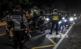 Petugas kepolisian memutarbalikan pemudik sepeda motor di posko penyekatan larangan mudik di Jalan Nanggeleng, Limbangan, Kabupaten Garut, Selasa (11/5). Pada H-2 menjelang Hari Raya Idul Fitri 1442 H, petugas gabungan di posko penyekatan larangan mudik Limbangan memutarbalikan ratusan pemudik sepeda motor dari arah Bandung menuju Garut dan Tasikmalaya karena tidak memiliki surat kesehatan serta ijin perjalanan. Foto: Republika/Abdan Syakura (FOTO : REPUBLIKA/ABDAN SYAKURA)