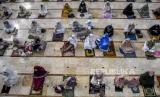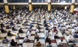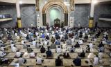 Umat muslim melaksanakan shalat Idul Fitri di Masjid Raya Bandung, Jalan Dalem Kaum, Kota Bandung, Kamis (13/5). Masjid Raya Bandung menggelar shalat Idul Fitri 1442 H dengan menerapkan protokol kesehatan seperti menjaga jarak, memakai masker, pengukuran suhu tubuh dan membatasi jumlah jemaah menjadi 30 persen dari kapasitas guna mengurangi resiko penyebaran Covid-19. Foto: Republika/Abdan Syakura (FOTO : REPUBLIKA/ABDAN SYAKURA)