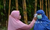 Pengukuran suhu tubuh warga sebelum mengikuti shalat Iedul Fitri di lapangan Teras Merapi, Srunen, Glagaharjo, Sleman, Yogyakarta, Kamis (13/5). Warga Dusun Kalitengah Lor dan Kalitengah Kidul diperbolehkan menggelar shalat Ied dnegan syarat pemberlakuan protokol kesehatan Covid-19. Dan shalat ini khusus untuk warga sekitar. Usai shalat juga tidak ada tradisi saling bersalaman antarwarga. (FOTO : Wihdan Hidayat / Republika)