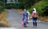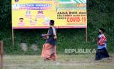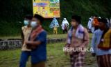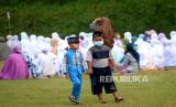 Warga bersiap mengikuti shalat Iedul Fitri di lapangan Teras Merapi, Srunen, Glagaharjo, Sleman, Yogyakarta, Kamis (13/5). Warga Dusun Kalitengah Lor dan Kalitengah Kidul diperbolehkan menggelar shalat Ied dnegan syarat pemberlakuan protokol kesehatan Covid-19. Dan shalat ini khusus untuk warga sekitar. Usai shalat juga tidak ada tradisi saling bersalaman antarwarga. (FOTO : Wihdan Hidayat / Republika)