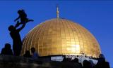 . Seorang anak Palestina bermain bersama ayahnya berpose dengan latar Masjid Kubah Batu usai melaksanakan sholat Idul Fitri di Kompleks Masjid Al Aqsa, Yerusalem, Kamis (13/5). (FOTO : AP/Mahmoud Illean)