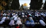 REPUBLIKA.CO.ID, YERUSALEM -- Umat Muslim Palestina melaksanakan sholat Idul Fitri 1442 H di Kompleks Masjid Al Aqsa, Yerusalem, Kamis (13/5).