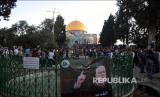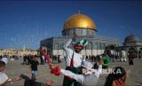Warga Palestina berkumpul di Kompleks Masjid Al Aqsa, Yerusalem, Kamis (13/5), usai melaksanakan sholat Idul Fitri 1442 H. (FOTO : AP/Mahmoud Illean)
