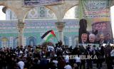 Poster foto pemimpin Hamas Ismail Haniyeh terpasang di Kompleks Masjid Al Aqsa, Yerusalem, Kamis (13/5). (FOTO : AP/Mahmoud Illean)