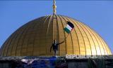 Seorang pemuda mengibarkan bendera Palestina dengan latar Masjid Kubah Batu usai melaksanakan sholat Idul Fitri di Kompleks Masjid Al Aqsa, Yerusalem, Kamis (13/5). (FOTO : AP/Mahmoud Illean)