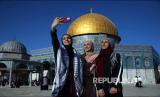 Tiga wanita Palestina berpose dengan latar Masjid Kubah Batu usai melaksanakan sholat Idul Fitri di Komplek Masjid Al Aqsa, Yerusalem, Kamis (13/5). (FOTO : AP/Mahmoud Illean)