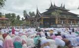 REPUBLIKA.CO.ID, SUMBAR -- Jamaah Tarekat Syattariyah melaksanakan shalat Idul Fitri di kawasan kompleks Makam Syekh Burhanuddin, Ulakan, Kabupaten Padangpariaman, Sumatera Barat, Jumat (14/5). Jamaah Syattariyah Sumbar menentukan 1 syawal memakai hitungan bilangan takwim qamsyiah dan melihat hilal (bulan) dengan mata telanjang sesuai tradisi turun-temurun, sehingga Idul Fitri 1442 Hijriyah jatuh pada Jumat (14/5/2021) atau sehari setelah waktu yang ditetapkan pemerintah, karena bulan sudah terlihat sejak Kamis (13/5/2021) malam.