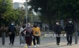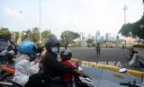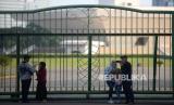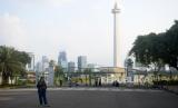 Warga berjalan di dekat pagar Monumen Nasional (Monas), Jakarta, Sabtu (15/5). Pada libur Lebaran 2021 kawasan Monas masih ditutup untuk pengunjung karena penerapan Pemberlakuan Pembatasan Kegiatan Masyarakat (PPKM). Hal itu membuat sejumlah warga harus menelan kekecewaan lantaran terlanjur datang dan hanya bisa berfoto dari luar pagar tanpa bisa bisa masuk ke dalam.Prayogi/Republika. (FOTO : Prayogi/Republika.)