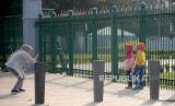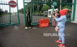 Warga berfoto di luar pagar Monumen Nasional (Monas), Jakarta, Sabtu (15/5). Pada libur Lebaran 2021 kawasan Monas masih ditutup untuk pengunjung karena penerapan Pemberlakuan Pembatasan Kegiatan Masyarakat (PPKM). Hal itu membuat sejumlah warga harus menelan kekecewaan lantaran terlanjur datang dan hanya bisa berfoto dari luar pagar tanpa bisa bisa masuk ke dalam.Prayogi/Republika. (FOTO : Prayogi/Republika.)