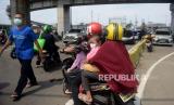 Sejumlah warga yang akan berwisata tertahan di Kawasan pintu masuk Taman Impian Jaya Ancol, Jakarta, Sabtu (15/5). Manajemen Taman Impian Jaya Ancol menghentikan sementara operasional kawasannya baik area rekreasi dan wisata Pantai Ancol pada hari ketiga libur Lebaran 1442 Hijriah yakni Sabtu (15/5) untuk dilakukan penyemprotan disinfektan dan evaluasi penguatan protokol kesehatan. Prayogi/Republika. (FOTO : Prayogi/Republika.)