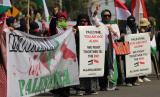 REPUBLIKA.CO.ID, SURABAYA -- Warga melakukan Aksi Bela Palestina di Surabaya, Jawa Timur, Senin (17/5/2021). Aksi itu mengecam tindakan agresi militer Israel ke Palestina.