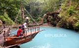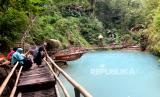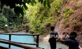 Pengunjung menikmati wisata di Air Terjun Kedung Pedut, Kulonprogo, Yogyakarta, Senin (17/5). Air Terjun Kedung Pedut menjadi salah satu destinasi wisata favorit di perbukitan Menoreh, Kulonprogo. Konsep Ekowisata menjadi daya tarik di sini. Dengan tarif masuk Rp 11 ribu pengunjung bisa menikmati air Terjun dan bisa bermain air dengan tingkat kedalaman. (FOTO : Wihdan Hidayat / Republika)