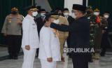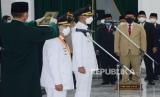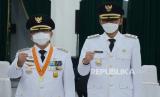 Gubernur Jawa Barat Ridwan Kamil melantik Bupati Cianjur Herman Suherman dan Wakil Bupati Cianjur TB Mulyana (kiri) di Gedung Sate, Kota Bandung, Selasa (18/5). Dalam sambutannya, Gubernur Jawa Barat berpesan agar selalu menjaga kekompakan dan bersinergi dengan berbagai pihak dalam membangun Kabupaten Cianjur hingga akhir masa jabatan yang baik, husnul khatimah, dan dikenang sebagai pemimpin Cianjur yang amanah. (FOTO : Edi Yusuf/Republika)