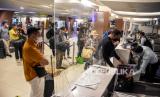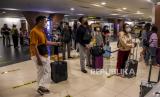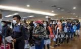 Sejumlah calon penumpang mengantre untuk konfirmasi (check in) sebelum melakukan penerbangan di Bandara Husein Sastranegara, Kota Bandung, Rabu (19/5). Pada hari kedua pascalarangan mudik Lebaran 2021, Bandara Husein Sastranegara kembali melayani penerbangan pesawat penumpang domestik dengan 21 jadwal penerbangan baik kedatangan maupun keberangkatan. Foto: Republika/Abdan Syakura (FOTO : REPUBLIKA/ABDAN SYAKURA)