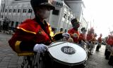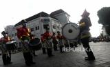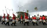 Anggota Aliansi Masyarakat Jogja menggunakan pakaian bregada menggelar unjuk rasa dukungan untuk Palestina di Titik Nol Yogyakarta, Kamis (20/5). Pada aksi ini Aliansi Masyarakat Jogja mengutuk agresi Israel ke Palestina. Dan mereka juga menuntut segera diadakan gencatan senjata atas nama kemanusiaan. (FOTO : Wihdan Hidayat / Republika)