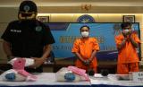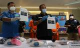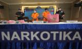 REPUBLIKA.CO.ID, SURABAYA -- Polisi menghadirkan tersangka dan barang bukti saat ungkap kasus peredaran narkotika di Badan Narkotika Nasional Provinsi (BNNP) Jawa Timur, Surabaya, Jawa Timur, Kamis (20/5).