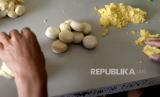 Karyawan membuat bakpia di industri rumahan Bakpia Jago, Patok, Yogyakarta, Jumat (21/5). Pascalebaran Idul Fitri pesanan bakpia mulai naik kembali. Pencabutan pelarangan mudik menjadi andil naiknya pengunjung ke Yogyakarta. Sehingga memengaruhi melonjaknya pesanan bakpia. Setiap hari di sini memroduksi bakpia sekitar 8 ribu biji. (FOTO : Wihdan Hidayat / Republika)