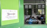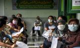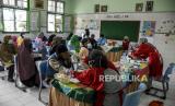 Sejumlah guru dan tenaga pendidik menunggu giliran untuk menjalani pemeriksaan kesehatan sebelum disuntik vaksin Covid-19 di SMPN 2 Bandung, Jalan Sumatera, Kota Bandung, Jumat (21/5). Pemerintah Kota Bandung melakukan percepatan vaksinasi Covid-19 bagi 36 ribu guru dan tenaga pendidik yang ditargetkan rampung pada akhir Mei 2021 guna mengejar target pembelajaran tatap muka pada Juli 2021 mendatang. Foto: Republika/Abdan Syakura (FOTO : REPUBLIKA/ABDAN SYAKURA)