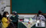 Vaksinator menyuntikan vaksin Covid-19 ke guru dan tenaga pendidik di SMPN 2 Bandung, Jalan Sumatera, Kota Bandung, Jumat (21/5). Pemerintah Kota Bandung melakukan percepatan vaksinasi Covid-19 bagi 36 ribu guru dan tenaga pendidik yang ditargetkan rampung pada akhir Mei 2021 guna mengejar target pembelajaran tatap muka pada Juli 2021 mendatang. Foto: Republika/Abdan Syakura (FOTO : REPUBLIKA/ABDAN SYAKURA)