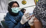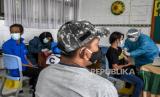 Vaksinator menyuntikan vaksin Covid-19 ke guru di SMPN 2 Bandung, Jalan Sumatera, Kota Bandung, Jumat (21/5). Pemerintah Kota Bandung melakukan percepatan vaksinasi Covid-19 bagi 36 ribu guru dan tenaga pendidik yang ditargetkan rampung pada akhir Mei 2021 guna mengejar target pembelajaran tatap muka pada Juli 2021 mendatang. Foto: Republika/Abdan Syakura (FOTO : REPUBLIKA/ABDAN SYAKURA)