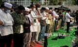 Sejumlah massa peserta aksi solidaritas Palestina melaksanakan shalat Ashar di depan Kedubes Amerika Serikat, Jakarta, Jumat (21/5). Aksi tersebut mengecam tindakan brutal Israel kepada warga Palestina di Gaza yang menyasar warga sipil, anak-anak dan bangunan-bangunan sosial lainnya bahkan fasilitas kesehatan.  (FOTO : Prayogi/Republika.)