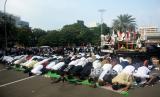 Massa aksi solidaritas Palestina melaksanakan shalat Ashar di depan Kedubes AS..