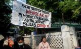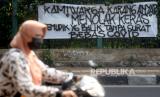 REPUBLIKA.CO.ID, JAKARTA -- Warga melintas di dekat spanduk peringatan untuk warga yang berkerumun di kawasan Sabang, Jakarta, Ahad (23/5). Tren jumlah pasien rawat inap di RS Darurat COVID-19 Wisma Atlet Kemayoran terus bertambah dalam lima hari terakhir. Penambahan itu seiring dengan banyaknya jumlah pemudik yang terpapar Covid-19 pada arus balik Lebaran.
