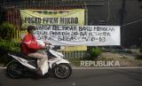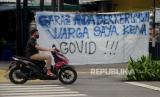 Pengendara melintas di dekat spanduk peringatan untuk pemudik di kawasan Karang Ayar, Jakarta, Ahad (23/5). Tren jumlah pasien rawat inap di RS Darurat COVID-19 Wisma Atlet Kemayoran terus bertambah dalam lima hari terakhir. Penambahan itu seiring dengan banyaknya jumlah pemudik yang terpapar Covid-19 pada arus balik Lebaran. Berdasarkan data Penerangan Komando Gabungan Wilayah Pertahanan (Kogabwilhan), jumlah pasien rawat inap di Wisma Atlet per Ahad (23/5) sebanyak 1.251 orang. Tren penambahan jumlah pasien di Wisma Atlet sudah terlihat sejak Rabu (19/5) di mana saat itu jumlah pasien yang dirawat sebanyak 931 orang.Prayogi/Republika. (FOTO : Prayogi/Republika.)