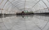Kristal garam mulai terbentuk saat proses pengeringan di dalam tunnel milik Kelompok Petani Garam Cirat Segoro Renges, Desa Tlogo Pragoto, Mirit, Kebumen, Jateng, Minggu (23/5/2021). Sistem garam tunnel enam tahap yang dikembangkan oleh Kementerian Kelautan dan Perikanan tersebut mampu menghasilkan garam hingga 1,2 ton untuk setiap set, dengan waktu pengeringan antara 40-60 hari dan masih tetap bisa berproduksi pada musim hujan. (FOTO : ANTARA/Idhad Zakaria)