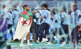 Mahrez mengibarkan bendera Palestina, sementara tubuhnya dibalut bendera negaranya, Aljazair. Sebelumnya Mahrez tertangkap kamera hanya berjubahkan bendera Aljazair.