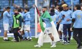 Riyad Mahrez dari Manchester City merayakan dengan bendera Aljazair setelah memenangkan Liga Premier Inggris, Ahad (23/5). (FOTO : REUTERS / Peter Powell )